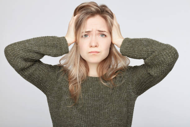 Forgetfulness concept. Studio shot of frustrated worried Scandinavian lady forgotten about parents wedding anniversary. Young blond Caucasian female touches head, saying: That almost slipped my mind.